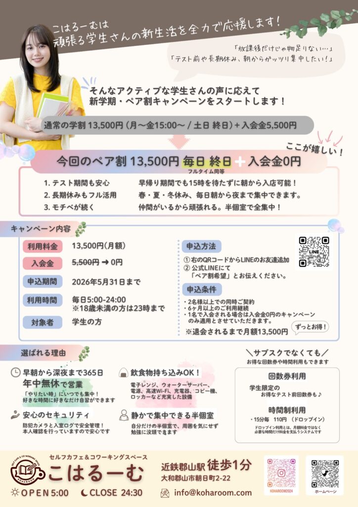 「こはるーむ」は、皆様がそれぞれの目的に合わせて快適に過ごせる空間を目指しています。